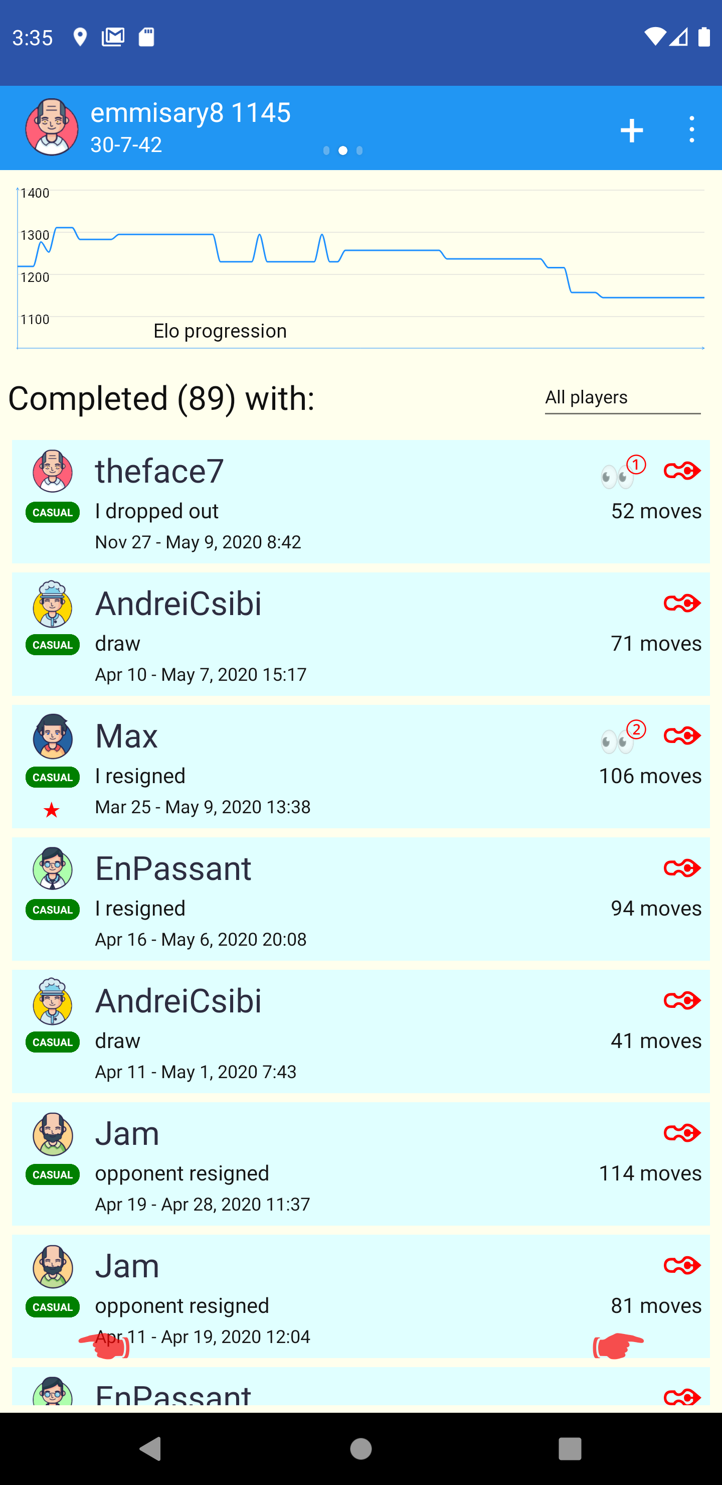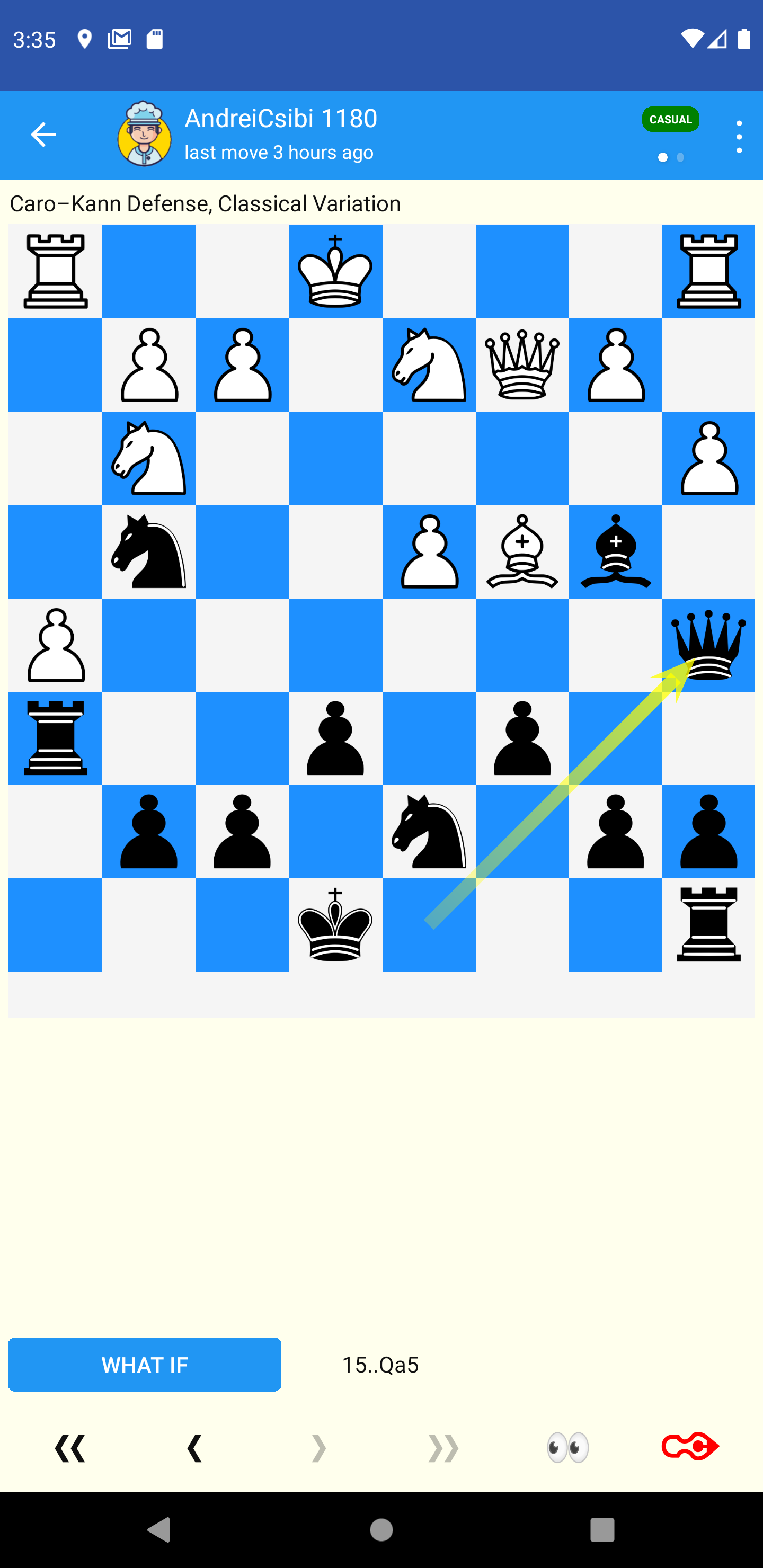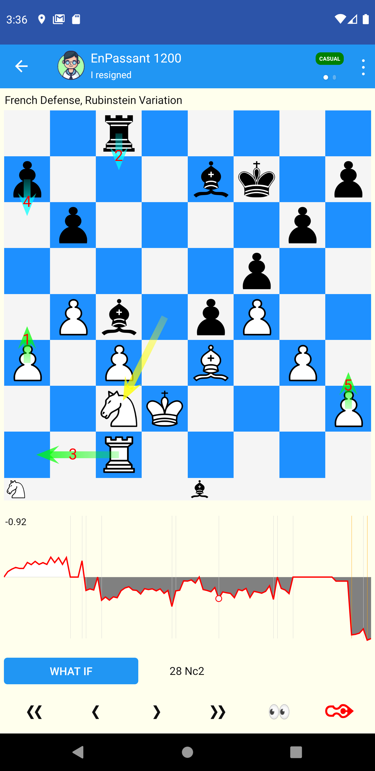 Shows the graph of how the game developed. Highlights bad moves and blunders, showing the alternative best move